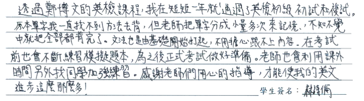 【學生心得分享】 透過鄭博文的英檢課程,我在短短一年就通過了英檢初級初試和複試。原本單字我一直找不到方法去背,但老師把單字分成小量多次來記憶,不知不覺中就把全部都背完了。文法也是由基礎開始打起,不用擔心跟不上内容。在考試前也會不斷練習模擬題本,為之後正式考試做好準備。老師也會利用課外時間另外找同學加強練習。感謝老師們用心的指導,才能使我的英文進步這麼那麼多!