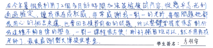 【學生心得分享】 在今年暑假我利用了兩個多月的時間加強英檢複試内容,從幾乎忘光到通過檢定,讓我很有成就感,非常感謝我一對一的老師,每個問題她都很用心的挑出來講,也會回去複習前面的試題,所以整體掌握度很高,對於我這種不夠自律的學生,一對一課程很方便!剛好補習班可以,就不用再找老師了,最後感謝鄭博文提供獎金。