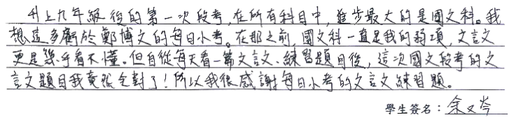 【學生心得分享】 升上九年級後的第一次段考,在所有科目中,進步最大的是國文科。我想這多虧於鄭博文的每日小考。在那之前,國文科一直是我的弱項,文言文更是幾乎看不懂。但自從每天看一篇文言文、練習題目後,這次國文段考的文言文題目我竟然全對了!所以我很感謝每日小考的文言文練習題。 【家長真誠推薦】 謝謝老師的用心教導。