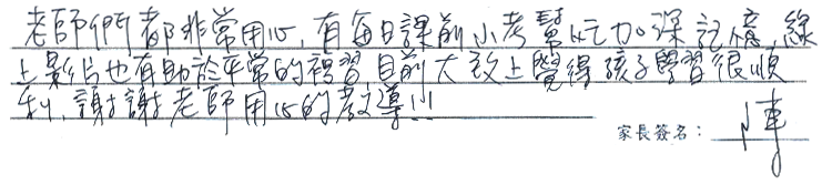 【學生心得分享】 其實我沒想到我會是第一名,在鄭博文上課時我能知道我最大的缺點,就是速度太慢了,不管是在英文科還是數學科,但我發現在鄭博文學習的過程我的速度有在慢慢加快,雖然有時還是有點來不及,不過我會繼續努力,也感謝老師們這幾個月的幫助,讓我有機會可以進步。 【家長真誠推薦】 老師們都非常用心,有每日課前小考幫忙加深記憶,線上影片也有助於平常的複習,目前大致上覺得孩子學習很順利,謝謝老師用心的教導!!