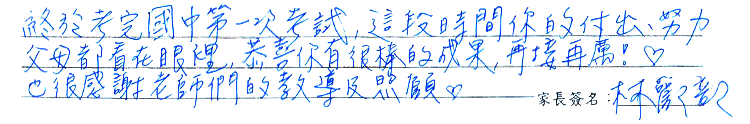 終於考完國中第一次考試,這段時間你的付出、努力父母都看在眼裡,恭喜你有很棒的成果,再接再厲!也很感謝老師們的教導及照顧。