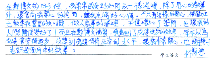 在鄭博文的日子裡,我常常感受到如同家一樣溫暖,除了用心的教導外,還會向我關心的詢問,讓我充滿好心情。不只有這樣的關心,補習班也教導我豐富的知識,做人處事的道理,不僅增加了學問,也讓我的人際關係變好了!而且在鄭博文補習,我看到了成績進步的效果,原本以為成績會變得退步,沒想到成績保持正常的水平,讓我非常開心,也謝謝老師幾個月來的教導。