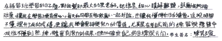 【學生心得分享】 在補習班學習的日子裡,對我幫助最大的是老師。她總是細心講解難題,鼓勵我們不要放棄,讓我在學習上更有信心。每天和同學互相激勵,一起討論,也讓我懂得合作的重要。這段時間不僅提升了我的成績,更讓我學會堅持與努力的價值。尤其是在考試前的練習與複習中,我從不懂到熟練,體會到努力的成果,也更加確定自己的目標與方向。