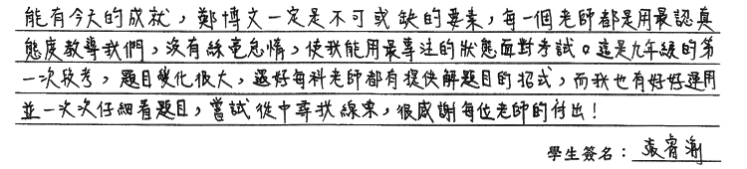 【學生心得分享】 能有今天的成就,鄭博文一定是不可或缺的要素,每一個老師都是用最認真態度教導我們,沒有絲毫怠情,使我能用最專注的狀態面對考試。這是九年級的第一次段考,題目變化很大,還好每科老師都有提供解題目的招式,而我也有好好運用並一次次仔細看題目,嘗試從中尋找線索,很感謝每位老師的付出!