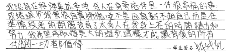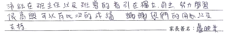 【學生心得分享】 我認為在與課業抗争時,有人在身旁陪伴是一件很幸福的事,成績退步我會很自責慚愧,並不是因為對不起自己,而是在準備段考的期間背負了太多人在我身上花的時間精力和努力,我希望再取得更大的進步,這樣才能讓背後的所有付出的一切都值得。 【家長真誠推薦】 沛紜在班主任以及班導的指引,在獨立、自主、努力學習,很高興可以有此次的成績,謝謝您們的用心以及支持。