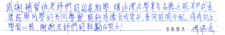 感謝補習班老師們的認真教學,讓泳潔在學業及品德上能有所成長,透過與同學的共同學習,能夠持續自我要求,善用時間分配,保有向上學習心態,謝謝老師們的鼓勵及努力!