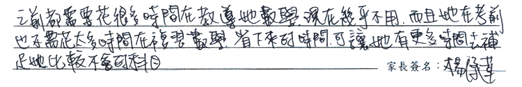 之前都需要花很多時間在教導她數學,現在幾乎不用,而且她在考前也不需花太多時間在複習數學,省下來的時間,可讓她有更多時間去補足她比較不會的科目。