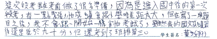【學生心得分享】 這次段考我在考前做了很多準備,因為是進入國中後的第一次段考,有一點緊張,怕成績會跟小學時差距太大,但在寫了一堆題目之後,我不會跟一開始一樣害怕考試了,雖然我的國文成績最後還是低於九十分,但還考到了班排第三。 【家長真誠推薦】 在這裡上課,老師會不定期的與家長溝通小孩的狀況,讓家長可以掌握學習的進度,孩子也比較認真的在學習,很放心把孩子交給這裡的老師,可以開心學習成長。