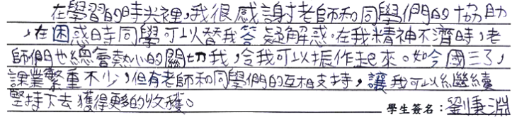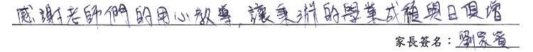 【學生心得分享】 在學習的時光裡,我很感謝老師和同學們的協助,在困惑時同學可以替我答疑解惑。在我精神不濟時,老師們也總會熱心的關切我,令我可以振作起來。如今國三了,課業繁重不少,但有老師和同學們的互相支持,讓我可以繼續堅持下去獲得更多的收穫。 【家長真誠推薦】 感謝老師們的用心教導,讓秉淵的學業成績與日俱增。