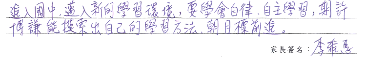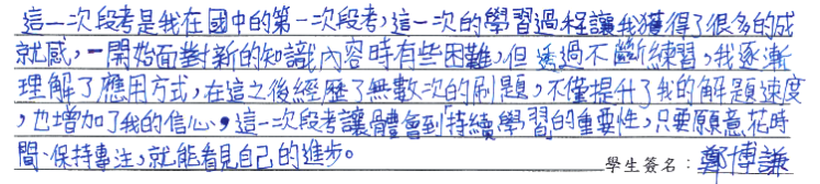 【學生心得分享】 這一次段考是我在國中的第一次段考,這一次的學習過程讓我獲得了很多的成就感,一開始面對新的知識內容時有些困難,但透過不斷練習,我逐漸理解了應用方式,在這之後經歷了無數次的刷題,不僅提升了我的解題速度,也增加了我的信心,這一次段考讓體會到「持續學習」的重要性,只要願意花時間、保持專注,就能看見自己的進步。 【家長真誠推薦】 進入國中,邁入新的學習環境,要學會自律、自主學習,期許博謙能摸索出自己的學習方法,朝目標前進。