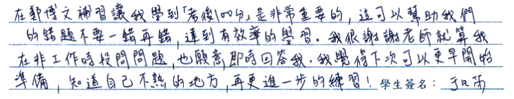 【學生心得分享】 在鄭博文補習讓我學到「考後100分」是非常重要的,這可以幫助我們的錯題不要一錯再錯,達到有效率的學習。我很謝謝老師就算我在非工作時段問問題,也願意即時回答我。我覺得下次可以更早開始準備,知道自己不熟的地方,再更進一步的練習!