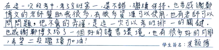 【學生心得分享】 在這一次段考中,考了全班第一,還不錯,繼續保持。也要感謝鄭博文的老師幫助我很多,有很多資源可以使用,也有老師可以問問題,把不會的弄懂,是這一次可以考班排一的關鍵。也感謝鄭博文給了一個好的讀書環境,也有很多好的同學,希望二段繼續加油!