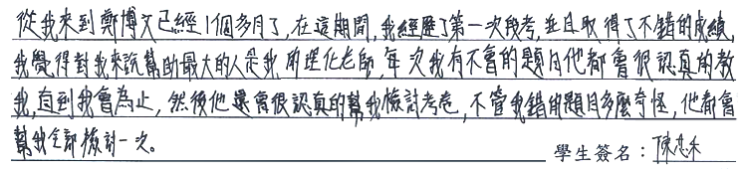 【學生心得分享】 從我來到鄭博文已經一個多月了,在這期間,我經歷了第一次段考,並且取得了不錯的成績,我覺得對我來說幫助最大的人是我的理化老師,每次我有不會的題目他都會很認真的教我,直到我會為止,然後他還會很認真的幫我檢討考卷,不管我錯的題目多麼奇怪,他都會幫我全部檢討一次。