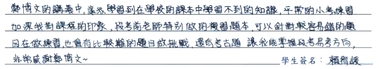 【學生心得分享】 鄭博文的講義中,讓我學習到在學校的課本中學習不到的知識,平常的小考練習加深我對課程的印象,段考前老師特别做的複習題本,可以針對較容易錯的題目在做練習,也會有比較難的題目做挑戰,還有考古題,讓我能掌握段考易考方向,非常感謝鄭博文~