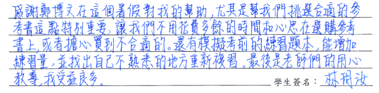 【學生心得分享】 感謝鄭博文在這個暑假對我的幫助,尤其是幫我們挑選合適的參考書這點特別重要,讓我們不用花費多餘的時間和心思在選購參考書上,或者擔心買到不合適的。還有模擬考前的練習題本,能增加練習量,並找出自己不熟悉的地方重新複習。最後是老師們的用心教導,我受益良多。