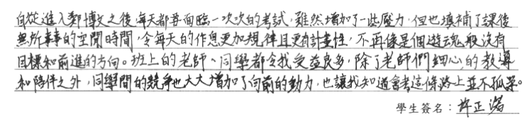 【學生心得分享】 自從進入鄭博文之後,每天都要面臨一次次的考試,雖然增加了一些壓力,但也填補了課後無所事事的空閒時間,令每天的作息更加規律且更有計畫性,不再像是個遊魂般沒有目標和前進的方向。班上的老師、同學都令我受益良多,除了老師們細心的教導和陪伴之外,同學間的競爭也大大增加了向前的動力,也讓我知道會考這條路上並不孤單。