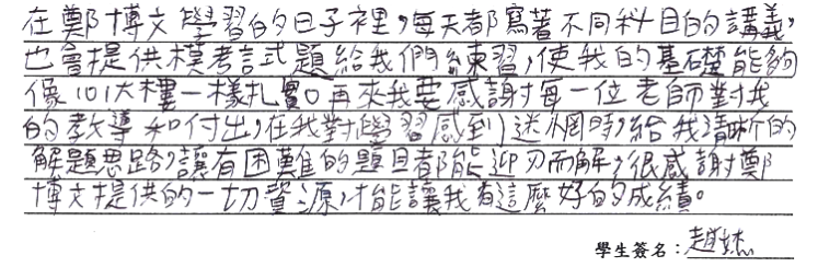 【學生心得分享】 在鄭博文學習的日子裡,每天都寫著不同科目的講義,也會提供模考試題給我們練習,使我的基礎能夠像101大樓一樣扎實。再來我要感謝每一位老師對我的教導和付出,在我對學習感到迷惘時,給我清晰的解題思路,讓有困難的題目都能迎刃而解,很感謝鄭博文提供的一切資源,才能讓我有這麼好的成績。