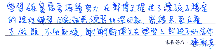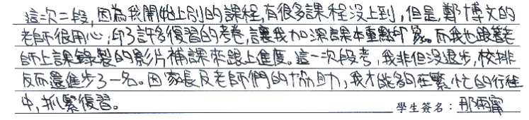 【學生心得分享】 這次二段,因為我開始上別的課程,有很多課程沒上到,但是,鄭博文的老師很用心,印了許多復習的考卷,讓我加深課本重點印象。而我也跟著老師上課錄製的影片補課來跟上進度。這一次段考,我非但沒退步,校排反而還進步了一名。因家長及老師們的協助,我才能夠在繁忙的行程中,抓緊復習。 【家長真誠推薦】 學習確實需要持續努力,在鄭博文提供了讓孩子穩定的課程練習,回家試卷練習加深印象,數學是要反覆去做題,不怕麻煩。謝謝鄭博文在學習上對孩子的陪伴