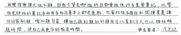 【學生心得分享】 我覺得鄭博文很不錯,因為不管是哪個科目都會提供許多重要筆記,比學校老師給的筆記多非常多,而且基本上都是重點,也會給很多題目和閱讀素養讓你回家刷題,增加題目量,讓自己遇到類似的題目可以拿到分又可以縮短解題時間,使自己有更多的檢查時間。