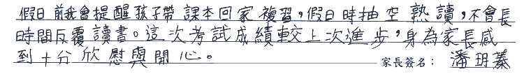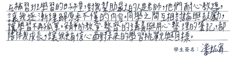 【學生心得分享】 在補習班學習的日子裡,對我幫助最大的人是老師,他們耐心教導,讓我逐漸理解原本不懂的內容。同學之間互相討論與鼓勵,讓學習不再孤單。安靜的教室、整齊的講義與用心整理的筆記,都陪伴我成長,讓我更有信心面對未來的學習挑戰與目標。 【家長真誠推薦】 假日前我會提醒孩子帶課本回家複習,假日時抽空熟讀,不會長時間反覆讀書。這次考試成績較上次進步,身為家長感到十分欣慰與開心。