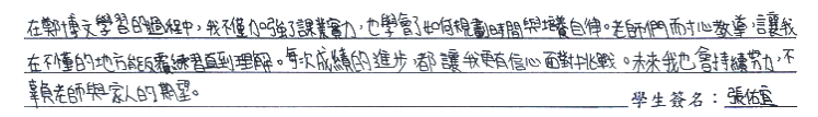 【學生心得分享】 在鄭博文學習的過程中,我不僅加強了課業實力,也學會了如何規劃時間與培養自律。老師們耐心教導,讓我在不懂的地方能反覆練習直到理解。每次成績的進步,都讓我更有信心面對挑戰。未來我也會持續努力,不辜負老師與家人的期望。