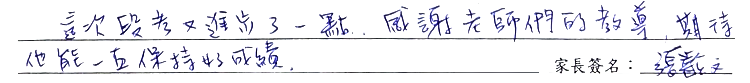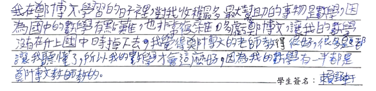 【學生心得分享】 我在鄭博文學習的日子裡,對我收穫最多,最大幫助的事物是數學,因為國中的數學有點難,也非常複雜。多虧鄭博文,讓我的數學沒有在升上國中時掉下去,我覺得鄭博文的老師教得很好,很多題都讓我聽懂了,所以我的數學才會這麼好,因為我的數學有一半都是鄭博文教師教的。 【家長真誠推薦】 這次段考又進步了一點,感謝老師們的教導,期待他能一直保持好成績。